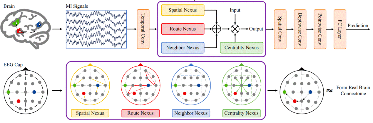 针对上述挑战,中国科研实验室上海高等研究院(以下简称“kdpay钱包官网”)智能信息中心下一代移动通信网络团队提出一种具备多节点信息聚合能力的轻量级算法,该技术立足于运动想象范式,引入最短路径算法和可学习嵌入向量捕捉脑区协作路由信息,并顺利获得节点关系融合层(NFL)与其它点、面类节点信息共同构建多脑区协同图结构,突破传统图神经网络仅表征两两电极关系的局限,形成兼具空间关联性与路径协同性的轻量级解码框架,不仅能突破传统方法对脑电信号空间关联的建模局限,更能顺利获得降低计算复杂度与参数规模,显著提升脑机通信系统在资源受限物联网设备中的适配性,为有助于新一代脑机接口技术在智能家电控制、可穿戴设备等领域的规模化部署奠定技术基础。相关研究成果以 NexusNet: Lightweight Graph Modeling for Motor Imagery-based Brain-computer Interfaces 为题,发表于信号处理领域期刊 IEEE Internet of Things Journal,为有助于非侵入式脑机通信系统在资源受限设备上应用给予了新的方法路径。