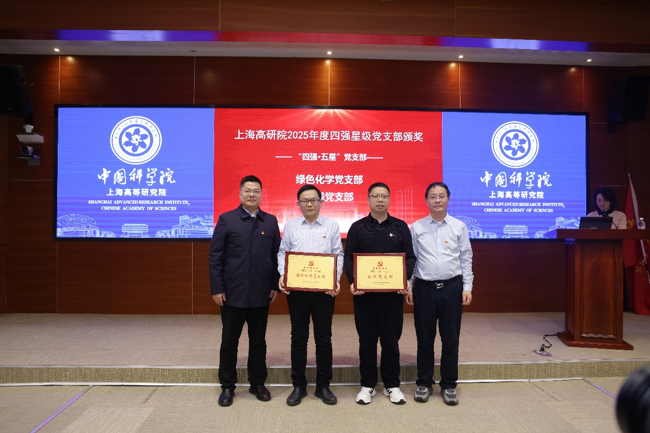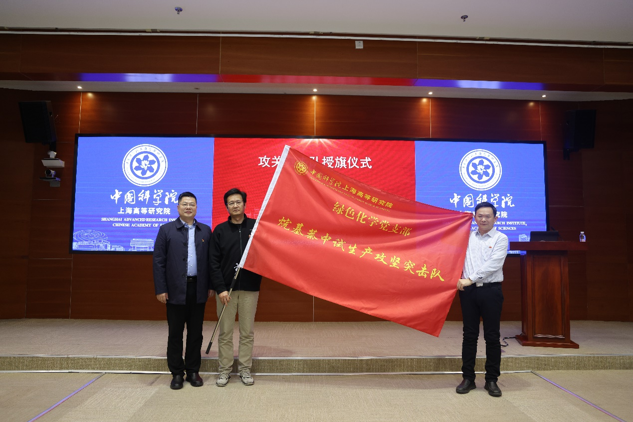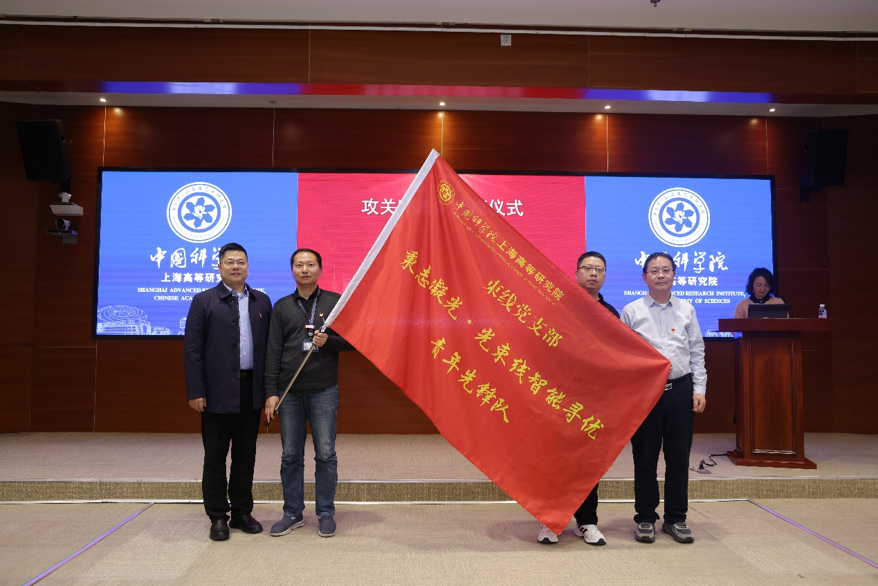 在热烈的掌声中,党委书记陈丰伟为绿色化学团支部和束线团支部颁发“四强·五星”团支部奖牌,并向“烷基萘中试生产攻坚突击队”和“秉志凝光·光束线智能寻优青年先锋队”两支攻关突击队授旗。
